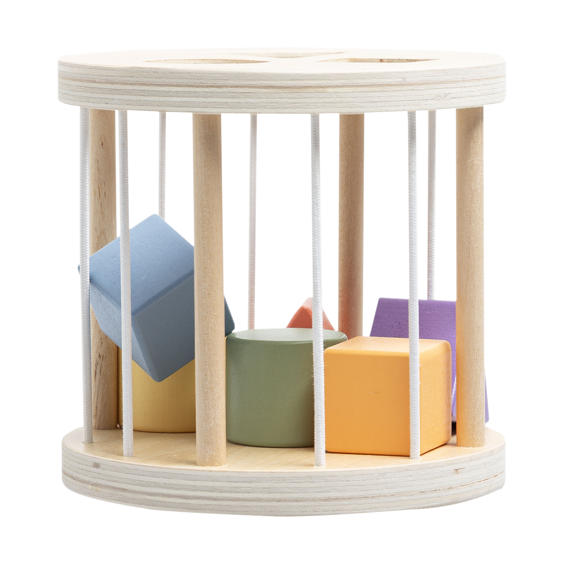 - Includes rolling wooden cylinder and 6 colorful geometric shapes