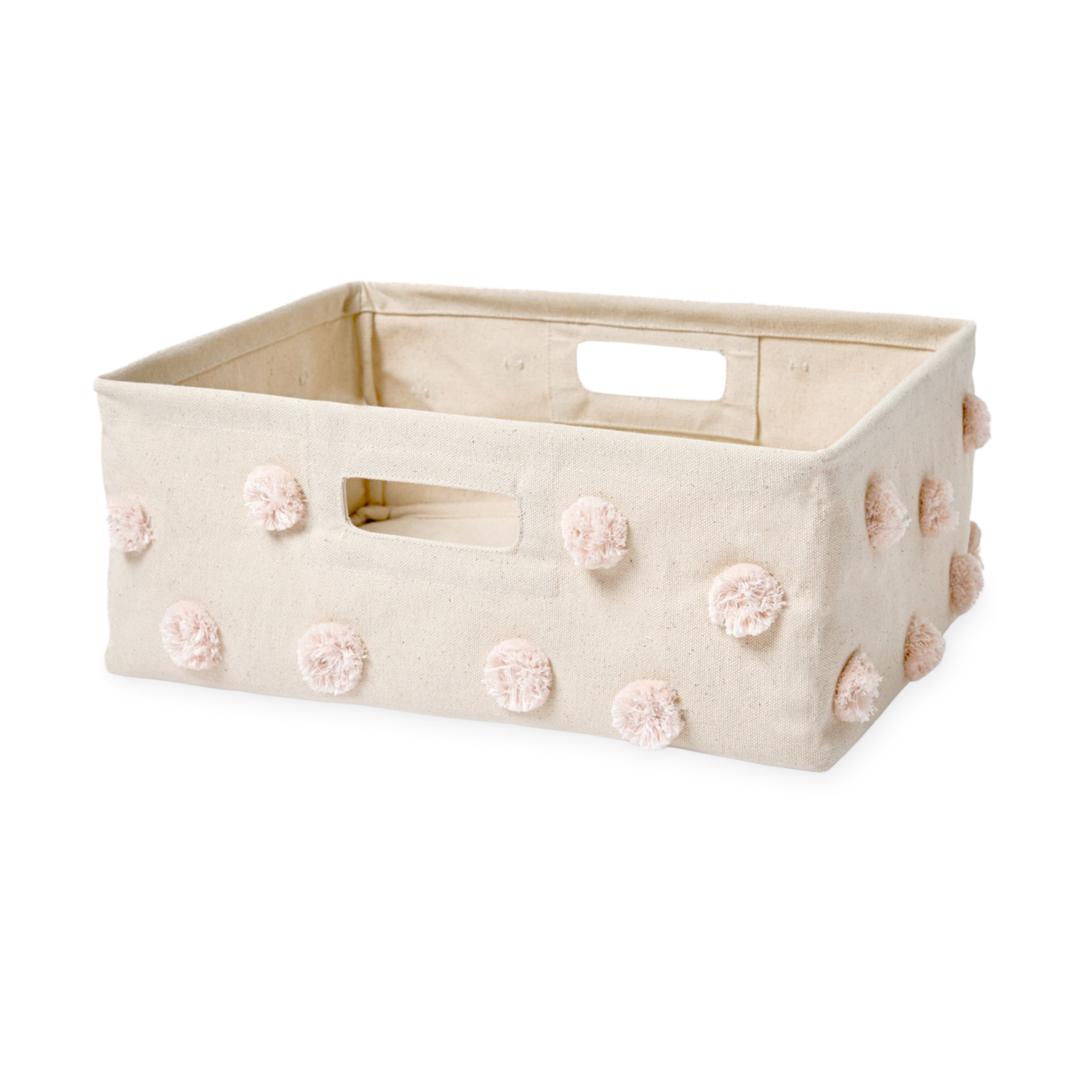I love the shape and dimensions of this fabric box. The hand holds are in just the right place for easy retrieval and the pompoms make it the cutest organizer in my closet.