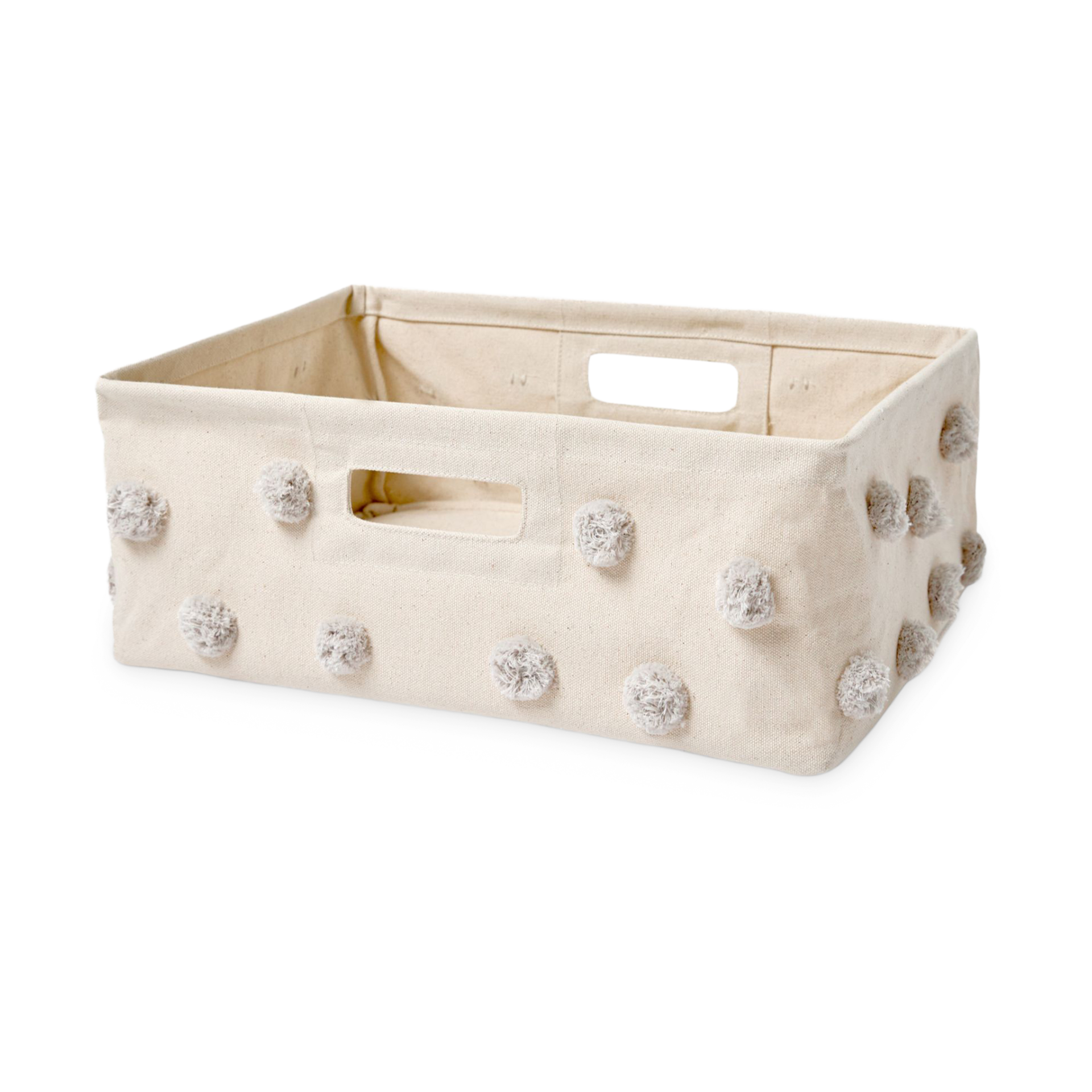 I love the shape and dimensions of this fabric box. The hand holds are in just the right place for easy retrieval and the pompoms make it the cutest organizer in my closet.