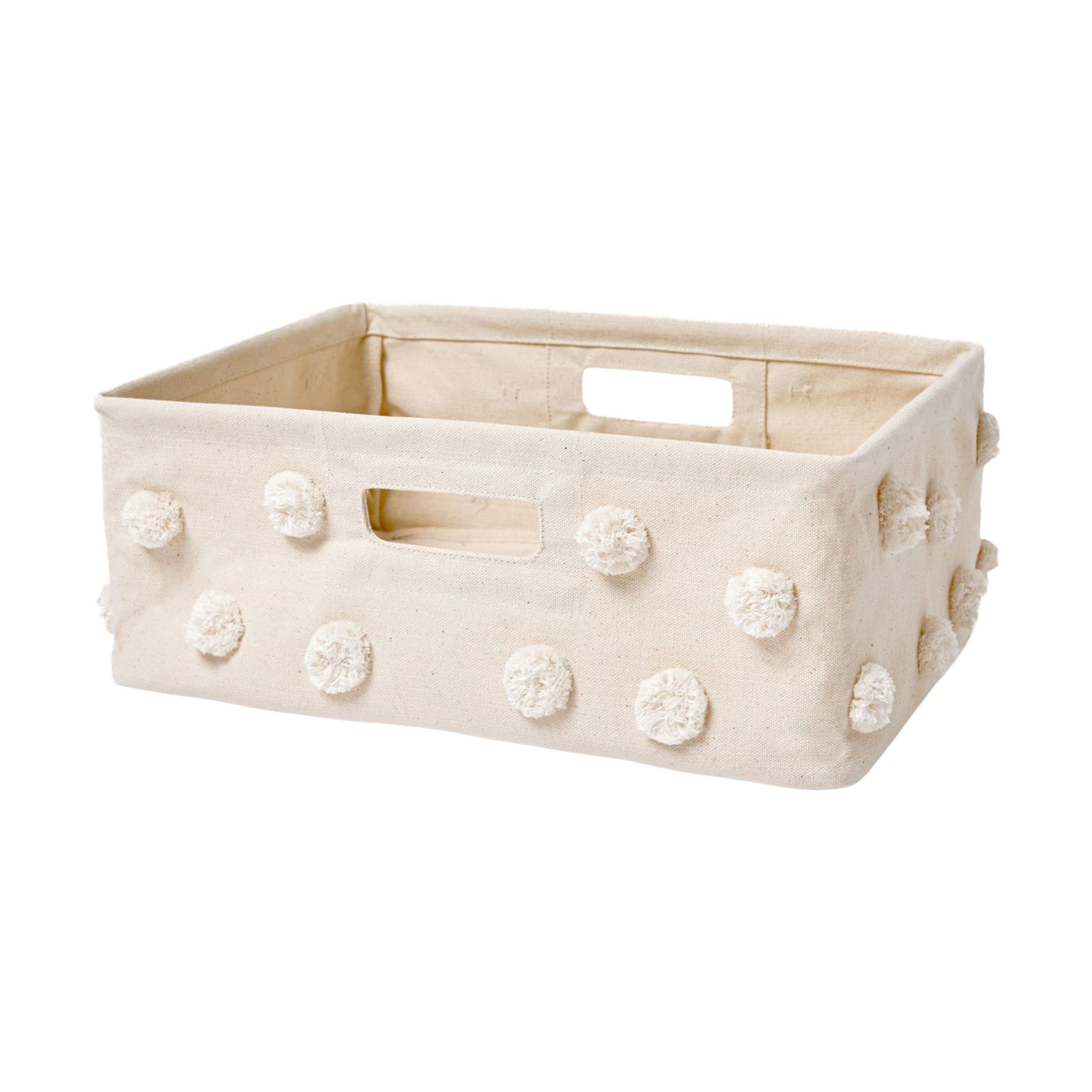 I love the shape and dimensions of this fabric box. The hand holds are in just the right place for easy retrieval and the pompoms make it the cutest organizer in my closet.