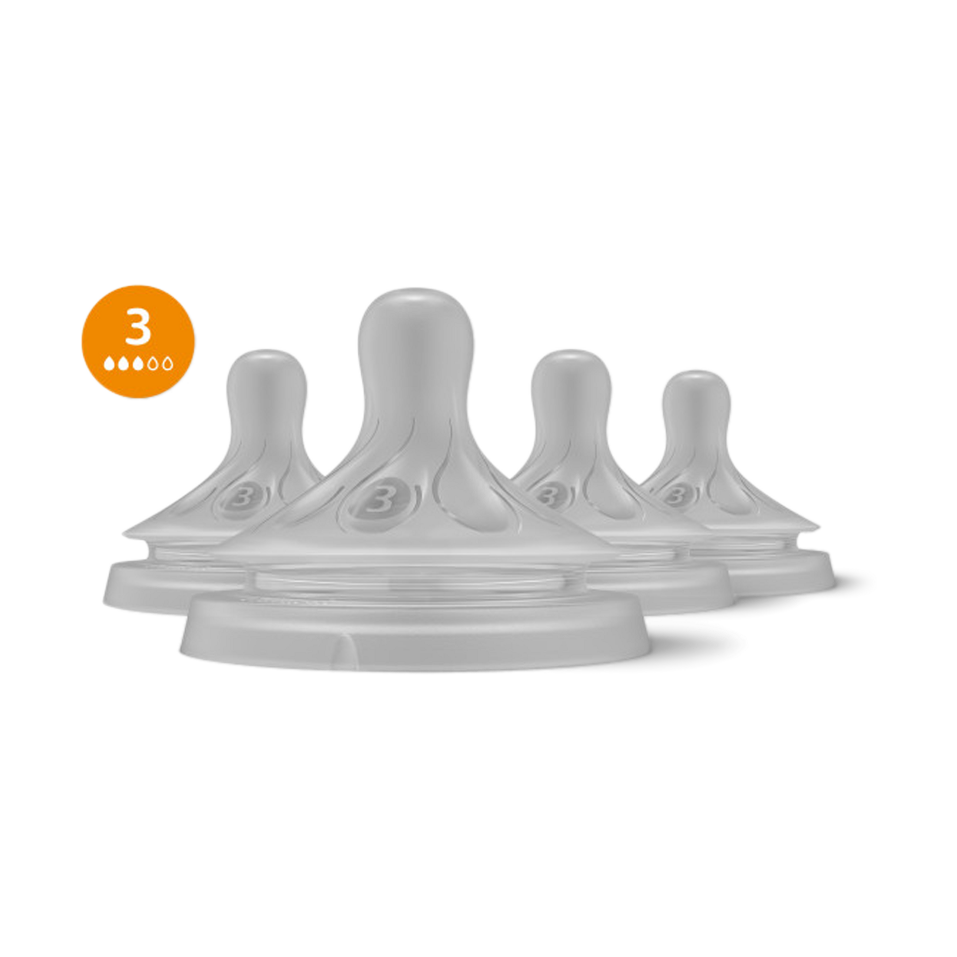 The nipple has a unique opening which only releases milk when baby actively drinks. When they pause to swallow and breathe, the milk pauses, too.