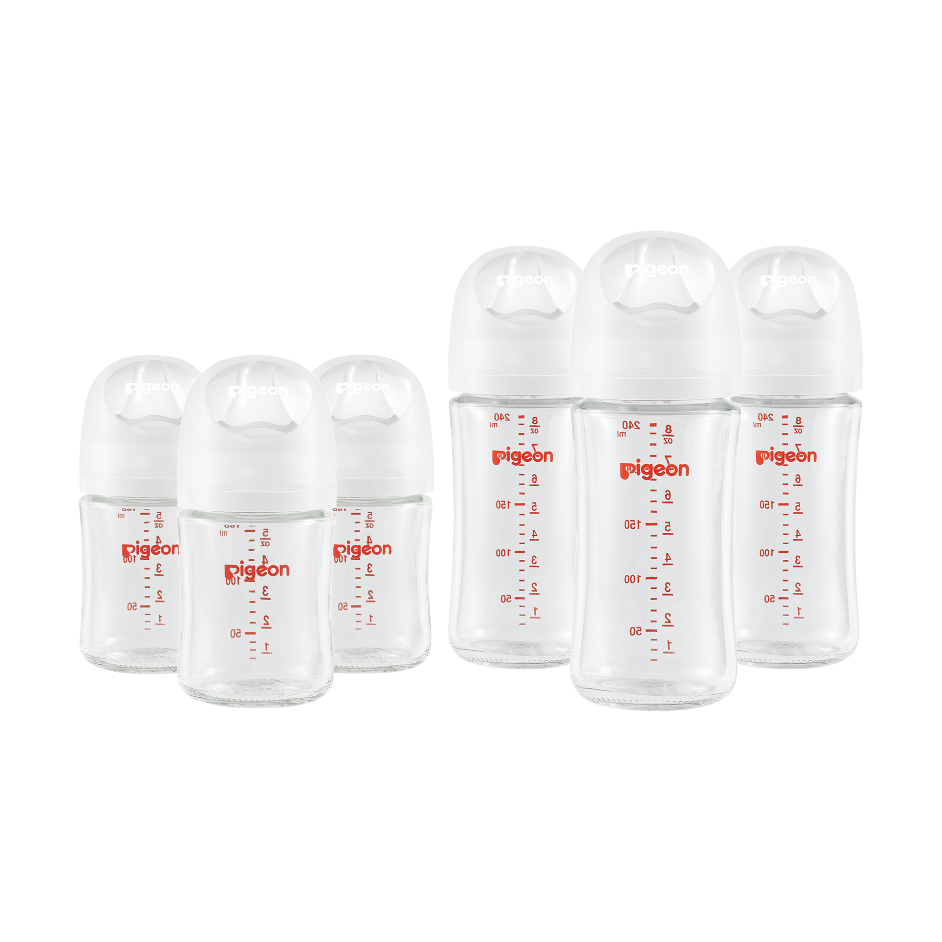 This Pigeon set includes the Glass Anti-Colic Nursing Bottle Wide Neck 3-Pack in both the 5.4 oz size and the 8.1 oz size.