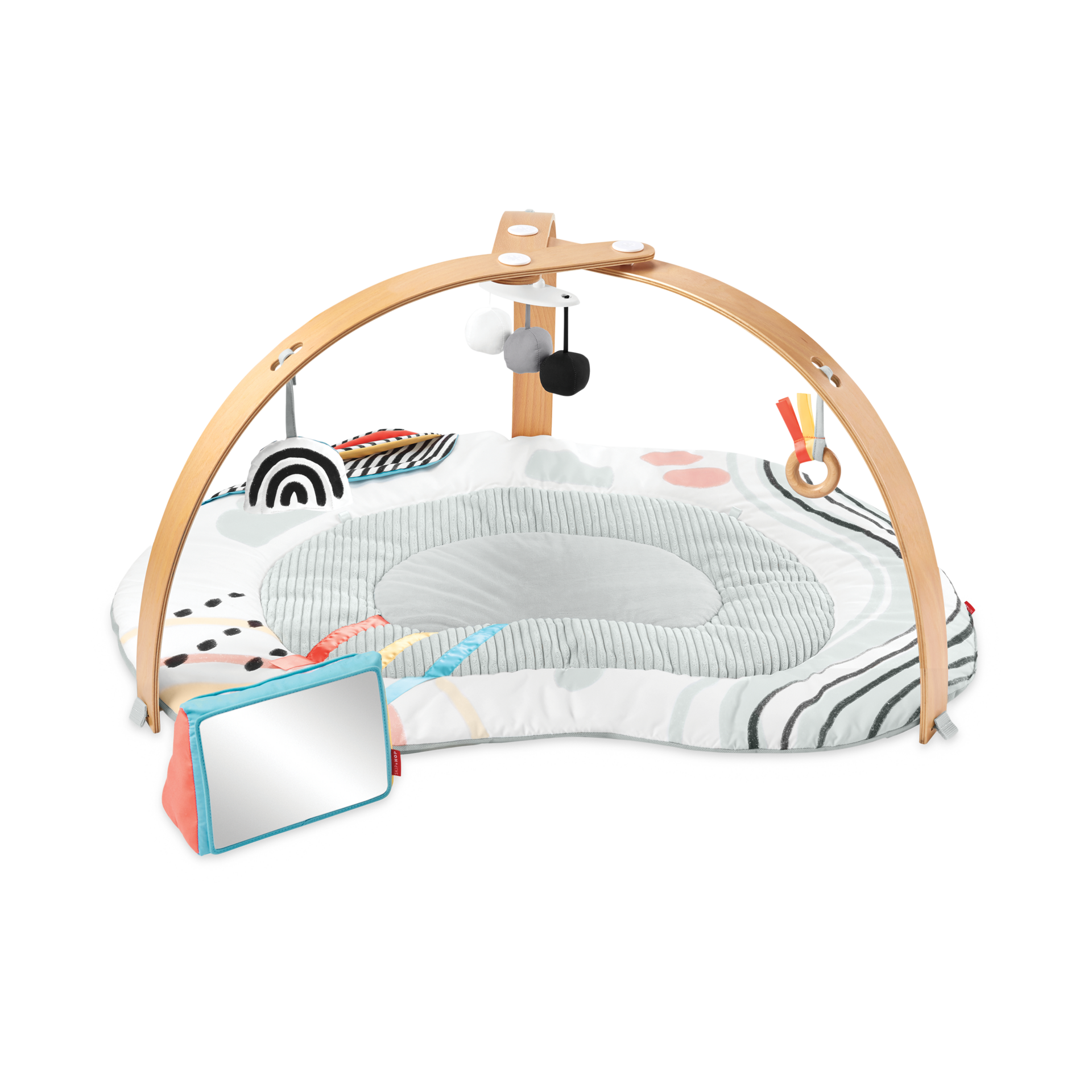 Crafted with sustainably-sourced wooden arches and a plush sensory playmat, the five nature-inspired developmental toys include contrasting patterns, crinkle sounds, a baby mirror and more to encourage self-directed activity and exploration. Six parent cards guide you through the gym’s milestone-driven play so you and baby can discover, learn and grow together.