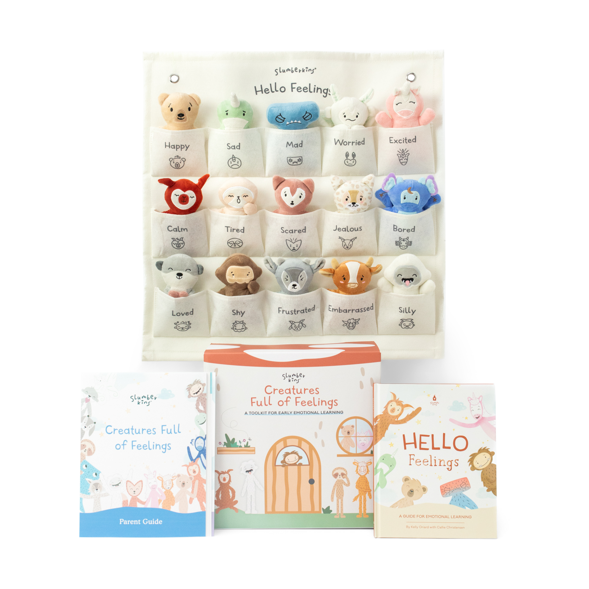 The Hello Feelings hardcover book is the heart of this toolkit. Inside, children meet 15 Slumberkins creatures, each one modeling a different feeling with real-life examples. This isn’t a front-to-back storybook; it’s a feelings guide you can return to again and again when big emotions arise.