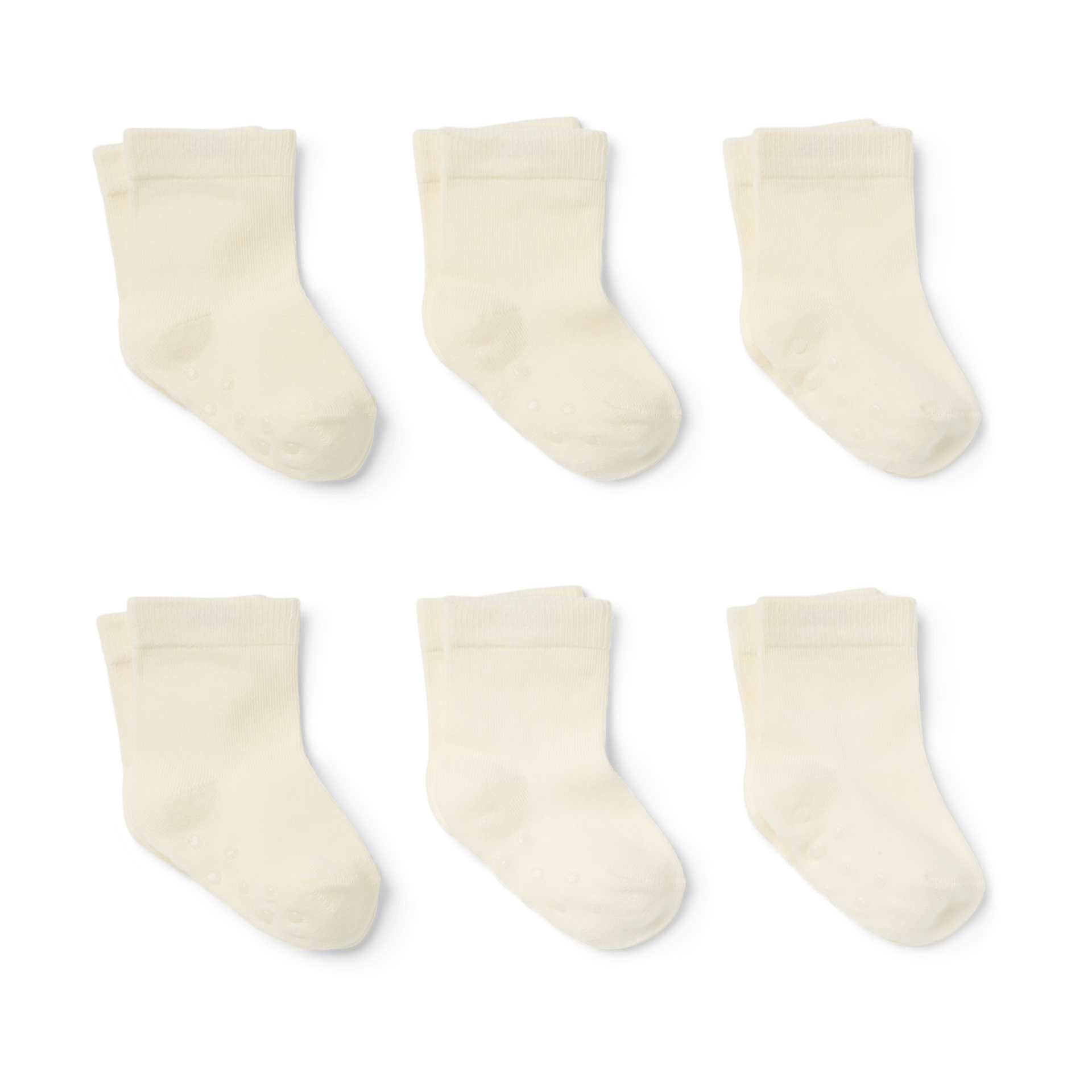 I got the white 3-12 month and they're a pretty off white cream color. I love the ease of mate matching after they come out of the wash. The material is soft and thick, keeping my baby's toes warm. I'm sure these socks will last through multiple kids. I like the crew length. Keeps them on baby easier.