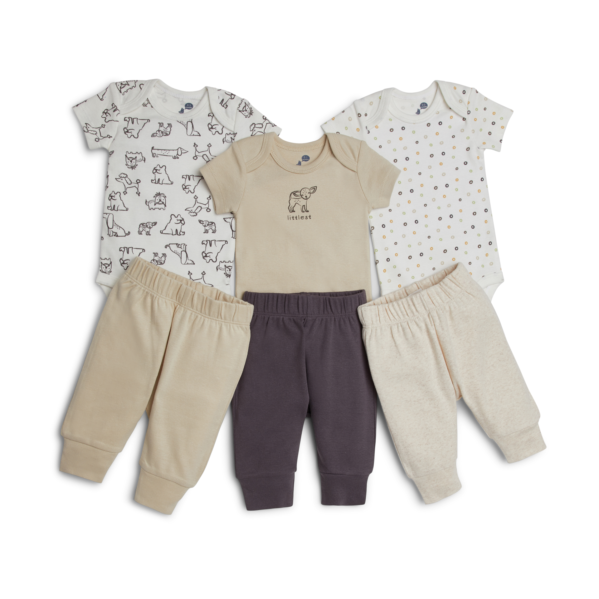 - Includes six pieces: three short-sleeve bodysuits and three pants