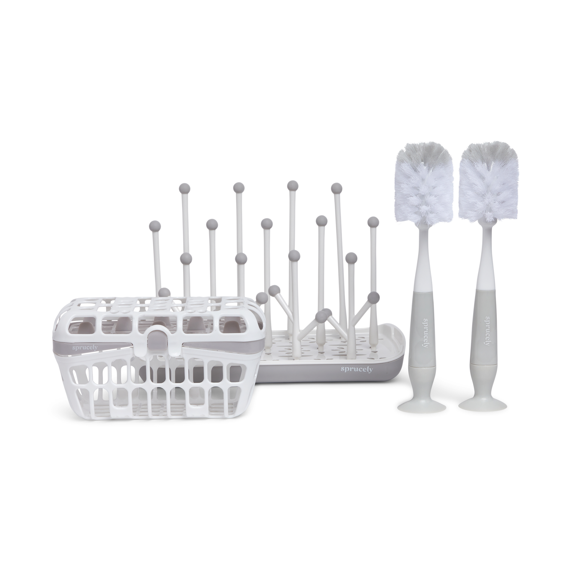 This Sprucely bundle comes with the Bottle Drying Rack, Bottle Brush, 2-Pack and Dishwasher Basket, usually sold separately.
