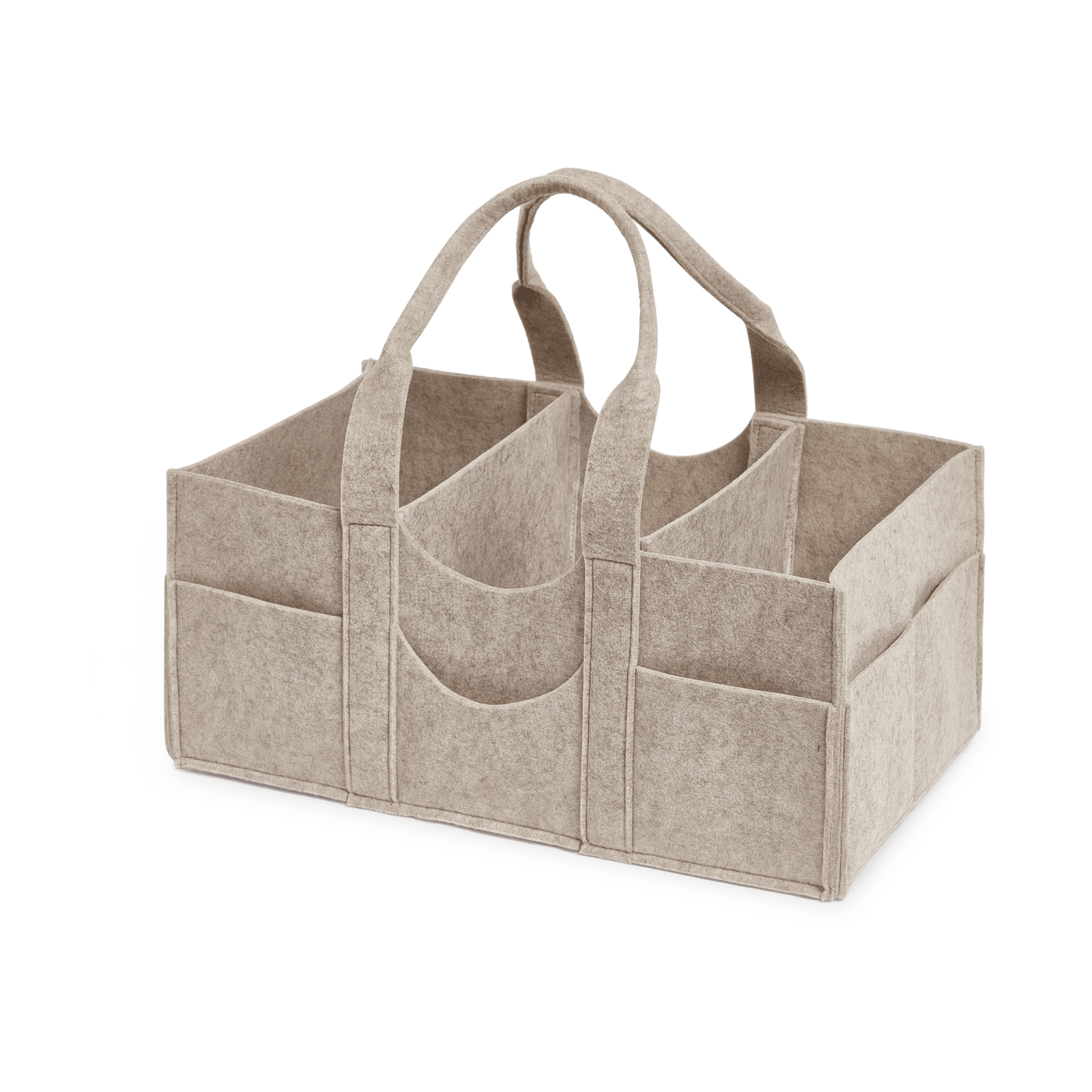 This is a really nice option for a diaper caddy! The neutral felt material is beautiful and will go with most color schemes. There are 2 dividers that you attach to Velcro on the inside, which makes organizing my diapers, wipes, diaper paste, and other necessities a breeze. I do wish the dividers had a bit more structure, they are a bit flimsy, so that way the shape of the caddy would hold better. Also, adding the option for smaller compartments would be great as well, if additional dividers