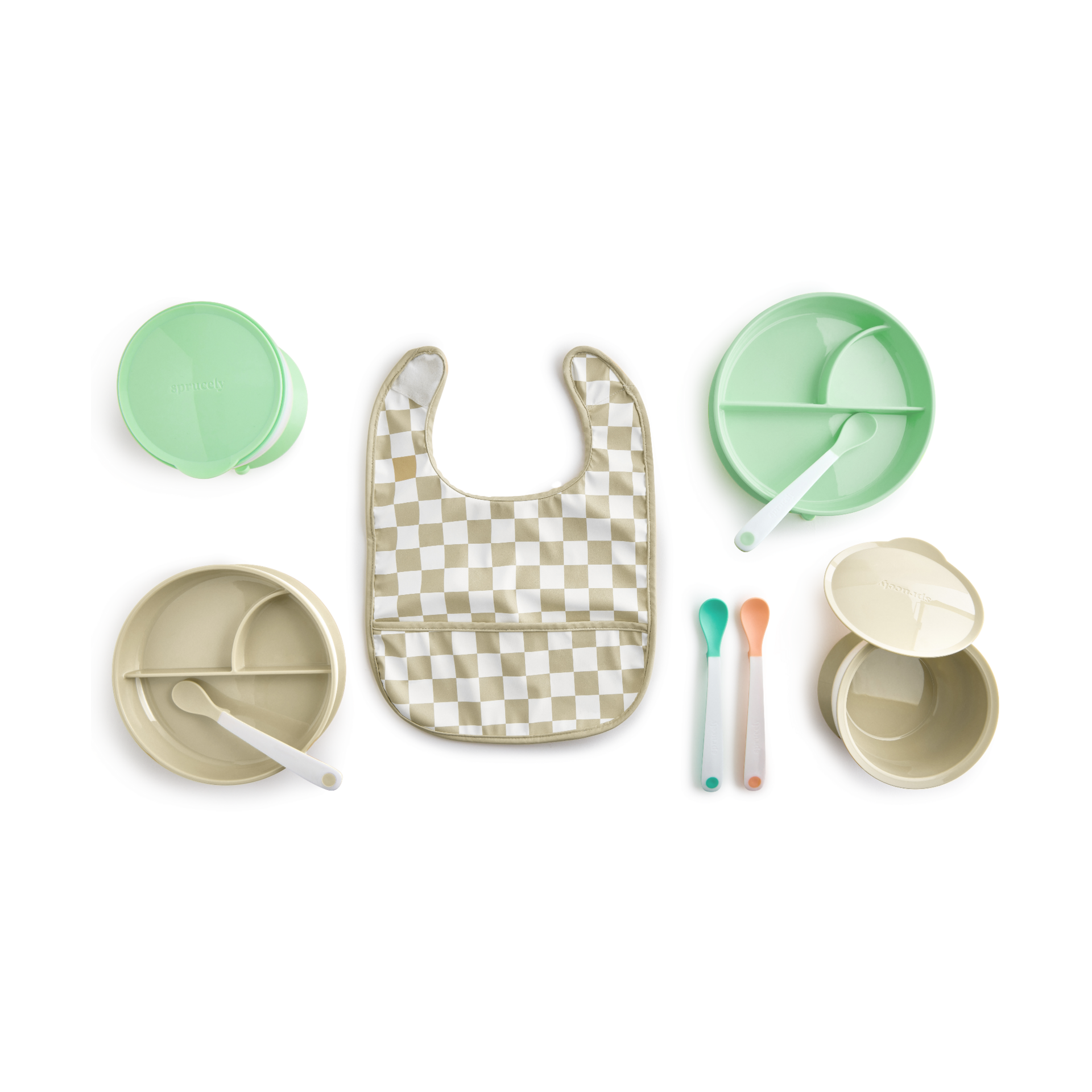The Solid Feeding Starter Set includes four baby spoons, two suction bowls with lids, two suction plates and a waterproof bib. It’s everything needed to start solids with ease.