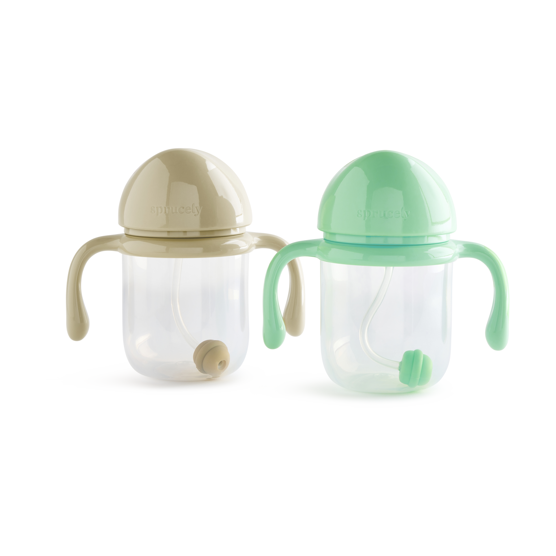 These spill-proof sippy cups feature a slow-flow, weighted straw that lets baby sip from nearly every position.