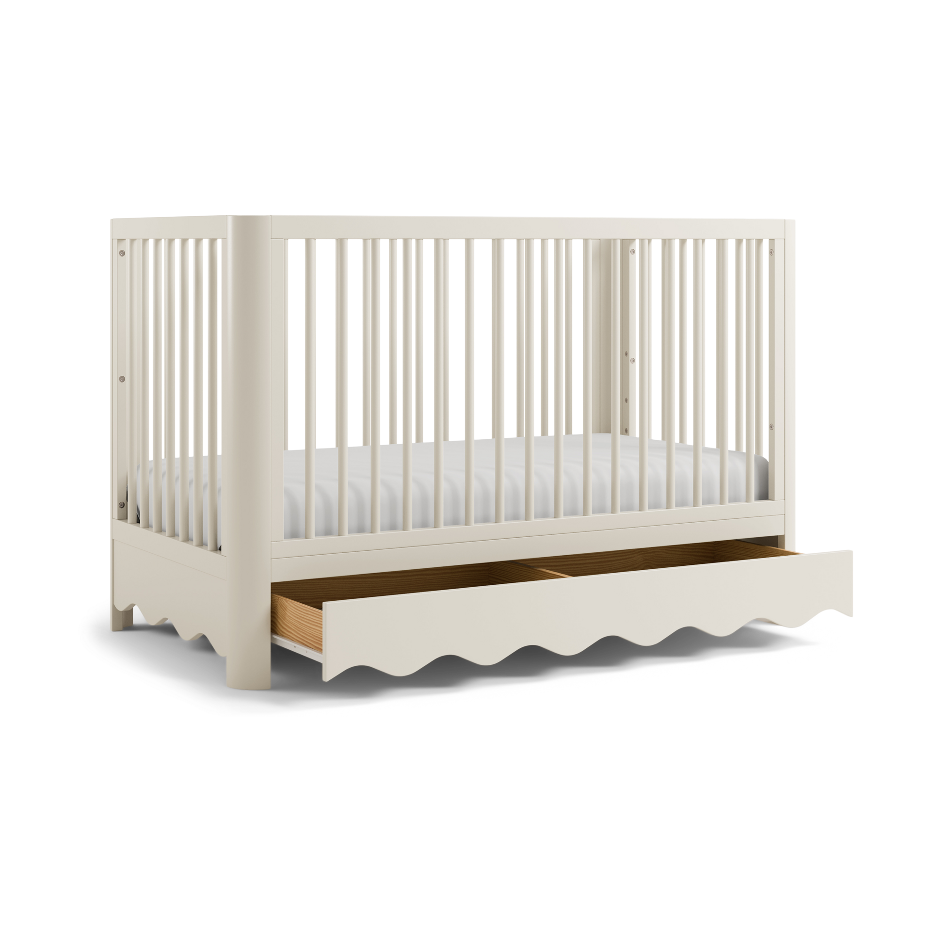 I was drawn to the scalloped detail of the crib and then realized it is also a storage drawer! I have a small nursery and this fits perfectly with additional storage for my little one. I love that it has rounded corners so I am not worried about sharp edges when baby is on the move. Also the perfect height for me getting baby in and out as I am more petite build.