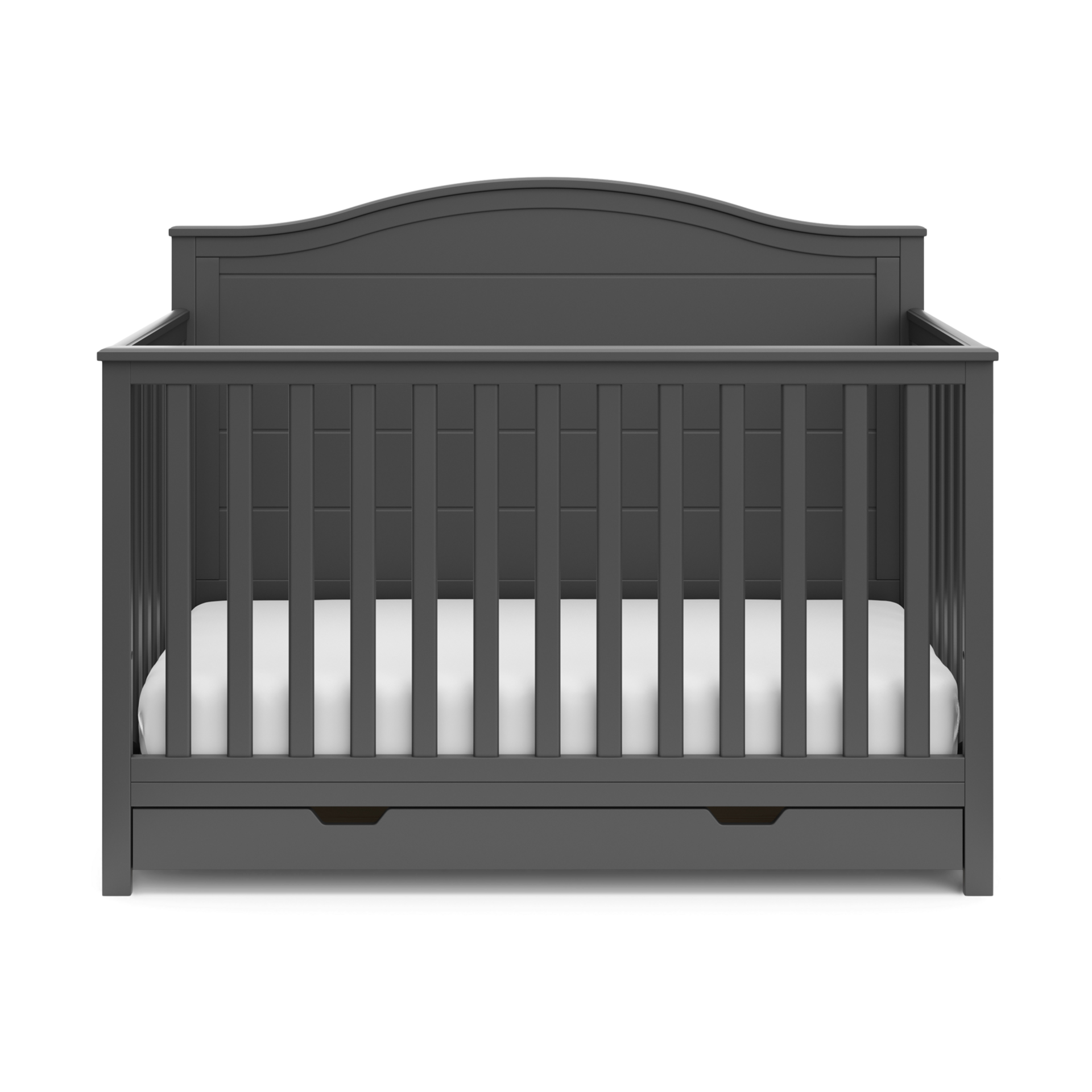 The Storkcraft Moss 4-in-1 Convertible Crib with Drawer is a modern farmhouse crib that’s all about the details. It features a mustache-curved headboard profile boasting wide shiplap detailing and a full-size under-crib storage drawer. It also transforms from a crib into a daybed, toddler bed and a full-size bed (conversion kits sold separately) for years of use.