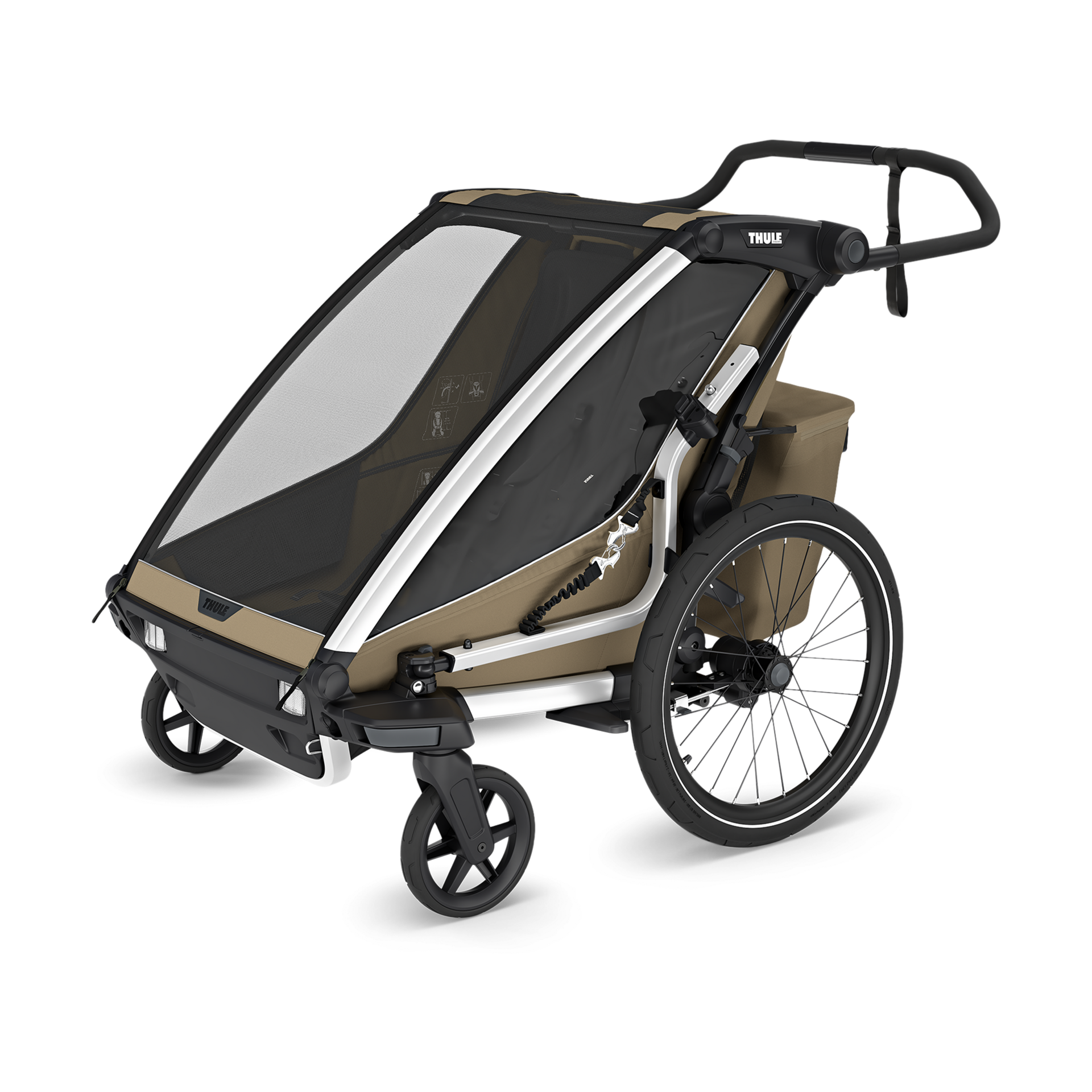 We bought the Thule Chariot double seater over a year ago. It’s been awesome. We use it as a stroller in town, or on trails paved or gravel does not matter. We use it behind our house on two tracks, in the yard etc. The feature where you can lean the child back when they fall asleep is perfect. Sometimes only one kid falls asleep so this helps big time. The infant sling was great as well. We also use the skis in the winter which works great. You can leave the front wheels in, and use the skis…