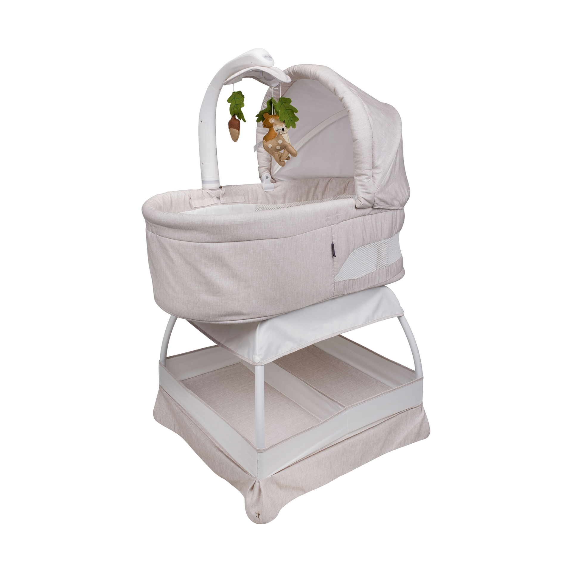 The TruBliss Sweetli Calm Bassinet helps calm and soothe baby with Play2Sleep Technology—your baby’s cry triggers soothing options to support a peaceful return to sleep. The Play2Sleep Mobile includes music, twinkling lights, spinning deluxe toys, vibration and a soft-glow night light (choose from ten gentle songs and five speeds of comforting vibration).