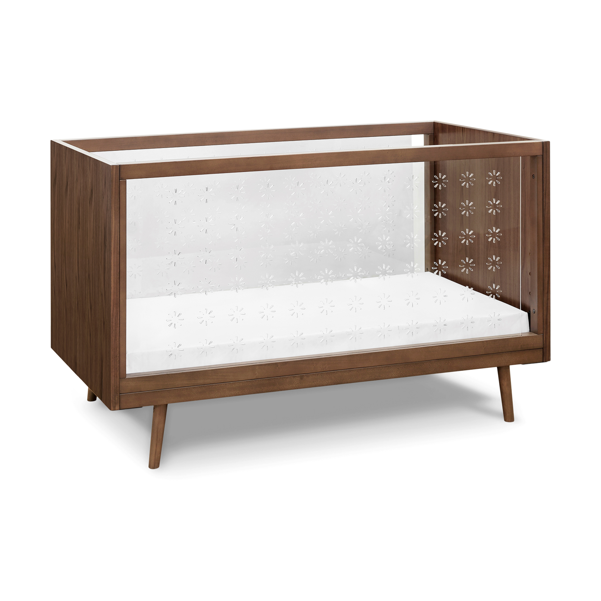 The Nifty Clear Crib lets your baby see the world around them while giving you greater visibility from afar. It combines the architectural lines of the mid-century aesthetic with contemporary clear acrylic sides for a modern look.