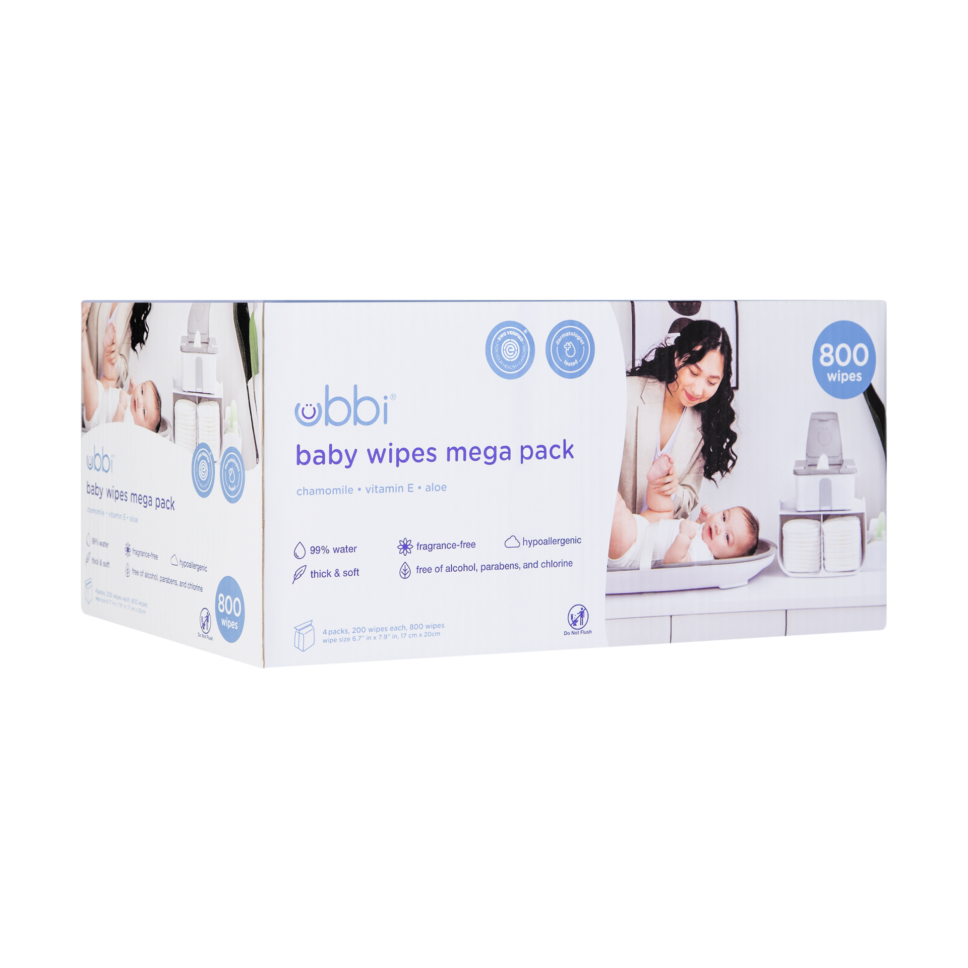 Fragrance-free, non-toxic wipes made with 99% water.