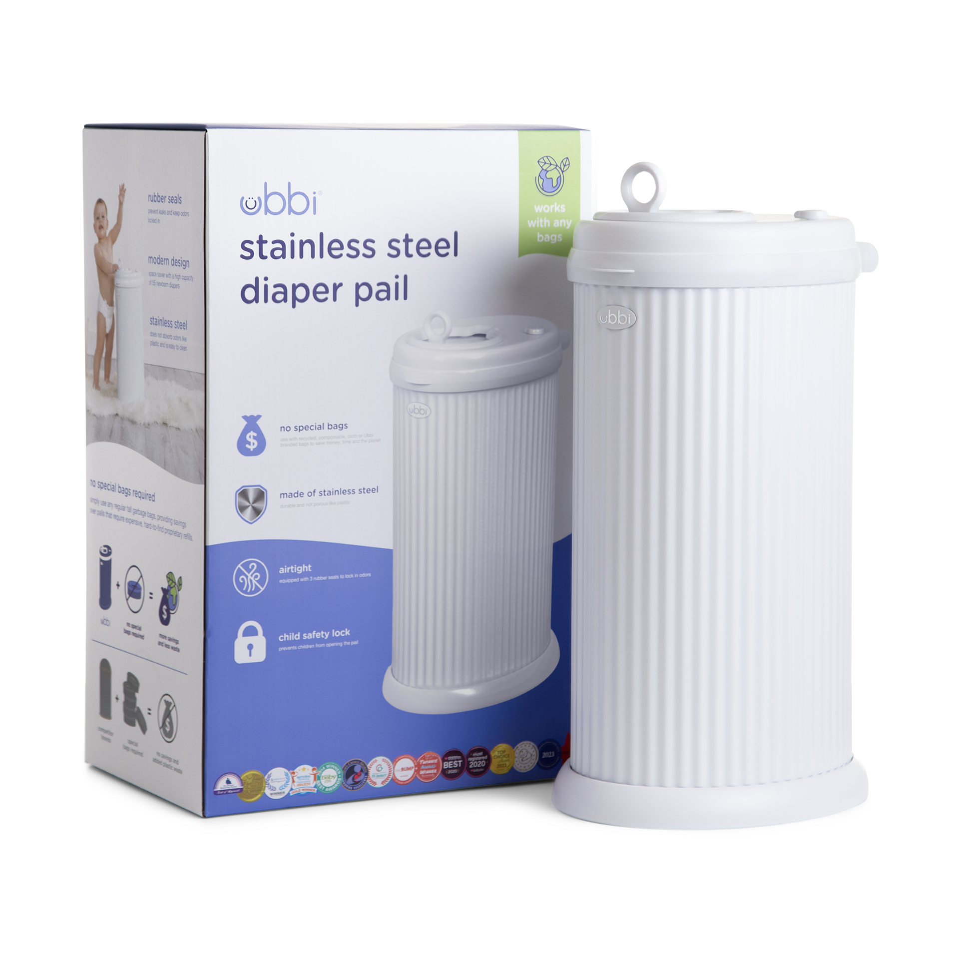 Crafted from powder-coated steel, the Ubbi Steel Diaper Pail provides maximum odor control.