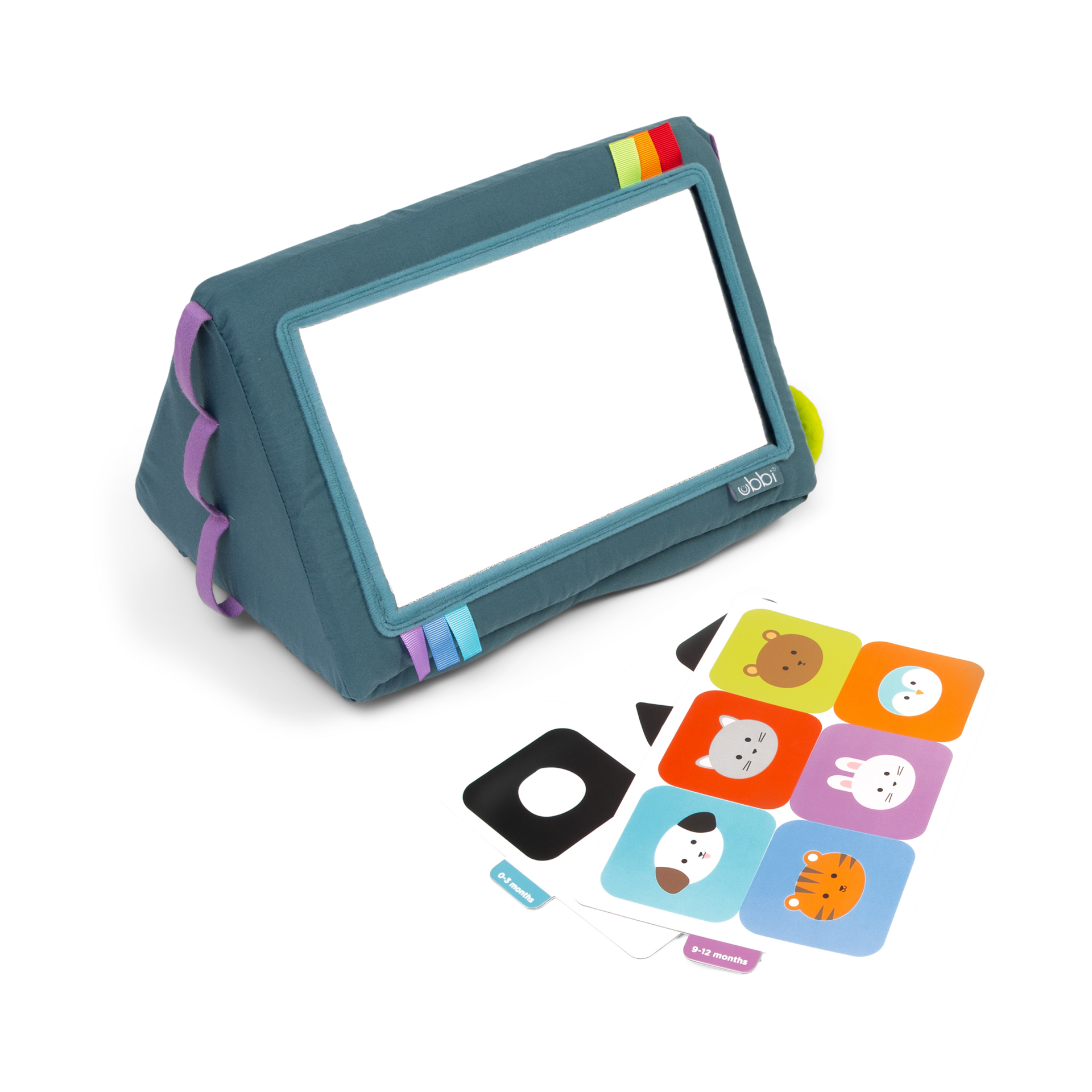 A baby-safe mirror promotes self-recognition and social interaction, while colorful ribbon tags enhance visual and tactile exploration.