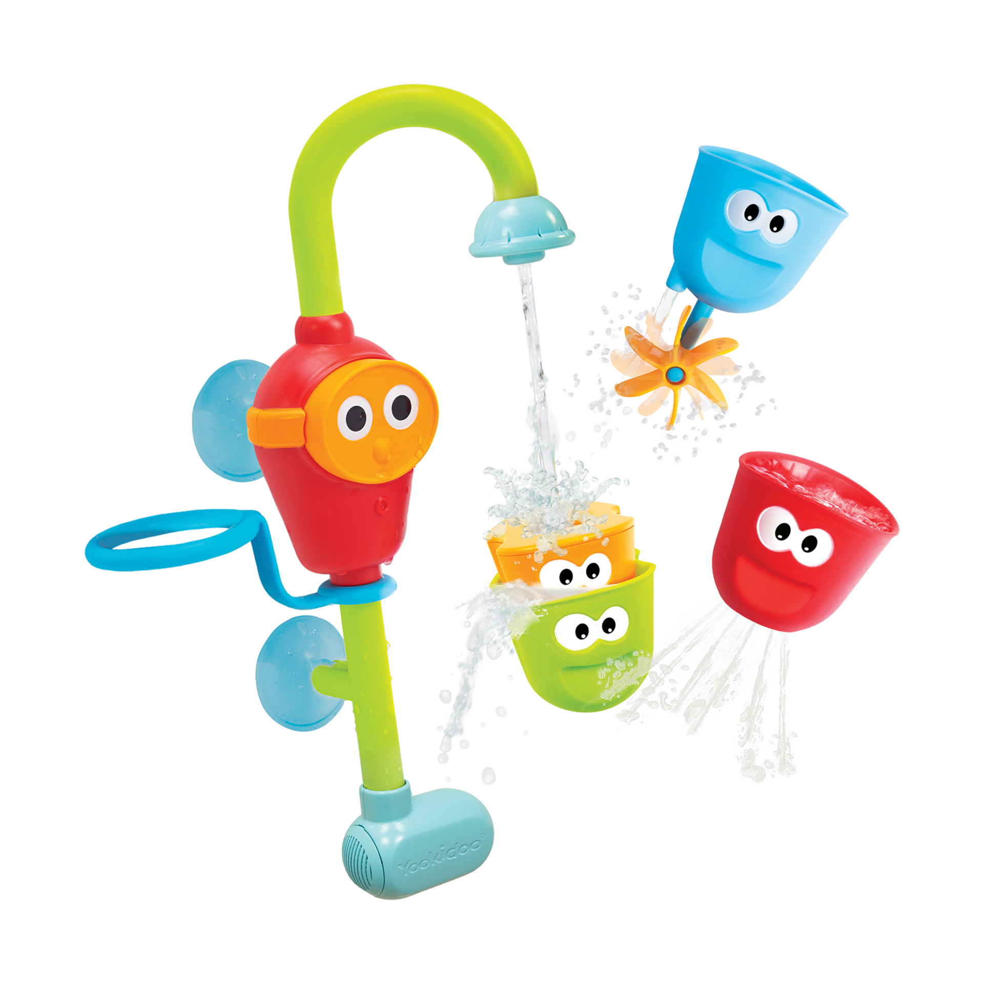 The battery-operated Flow ‘N’ Fill Spout attaches to the side of the tub with the pump suspended in the water. Little ones can press on the large, silly-eyed button to start the flow of water.