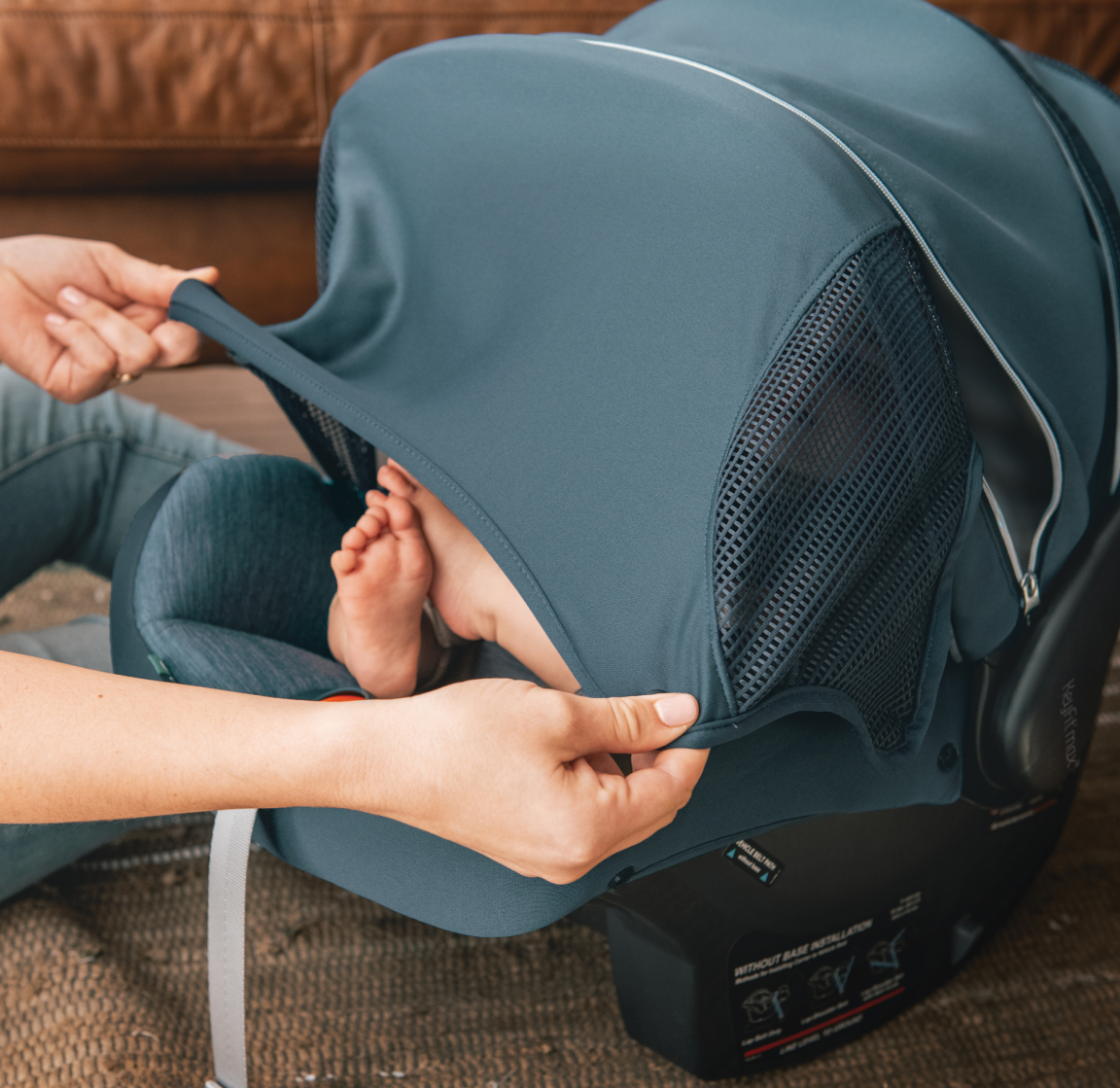 This canopy actually canopies. It zips out for full coverage all the way to baby’s feet—perfect for blocking out midday sun. Unzip the canopy further and you’ll find mesh peekaboo panels that let you check in on your little one and increase airflow on warm days. There are magnetic closures on the base of the seat that hold the canopy in place. Check it out at 2:25 in our video review—we’ve usually only seen canopies like this on seats with much higher price tags.