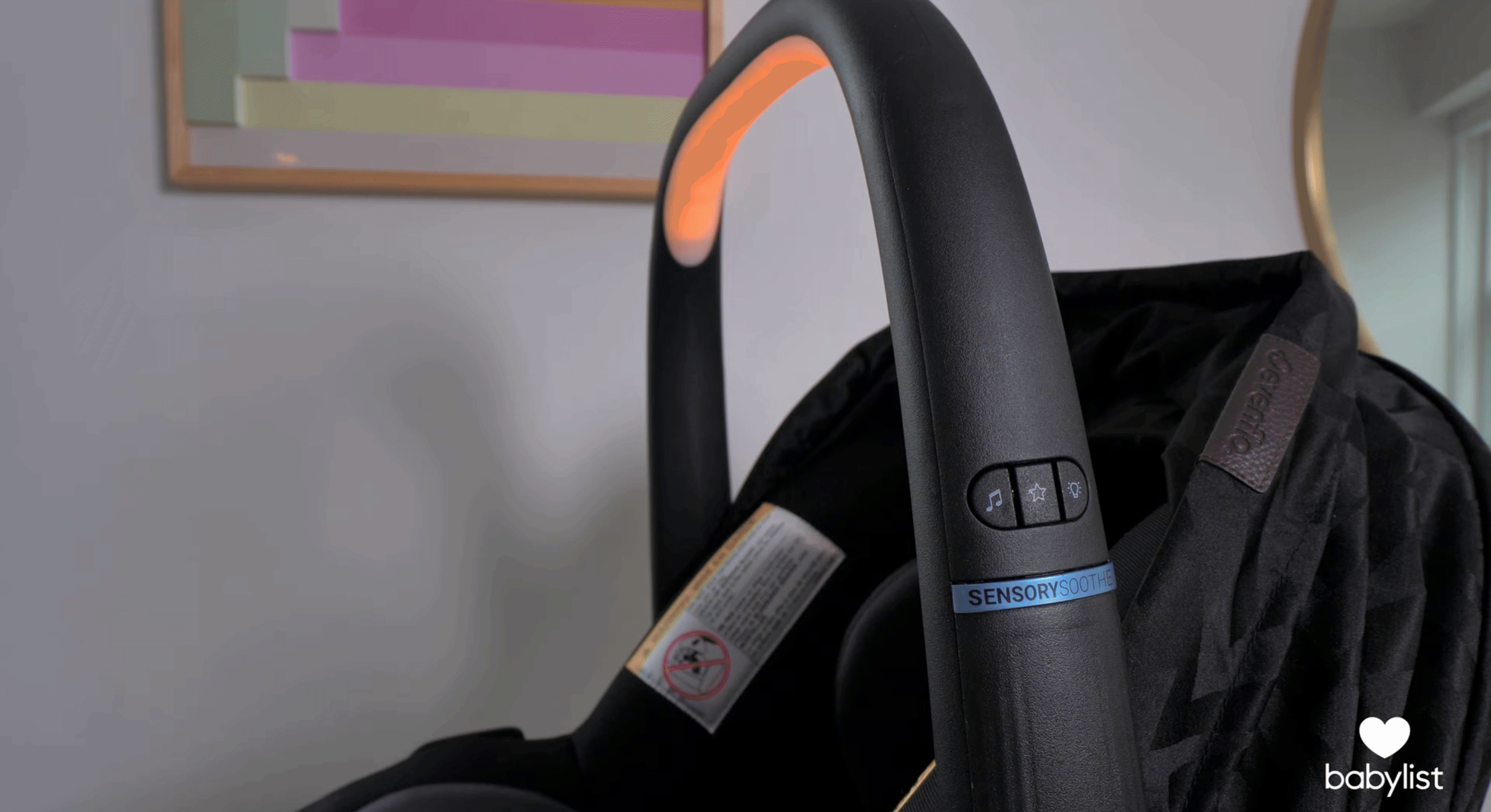 To control it, there are three buttons on the side of the car seat bar. One controls the lights, another the sounds, and a third selects from preset combinations of both lights and sounds. (1:00) But if you need to activate SensorySoothe while you’re moving, you can use Siri and Google alerts to help turn it on hands-free. SensorySoothe can also be controlled via the Evenflo app if you have a copilot in the passenger seat.
