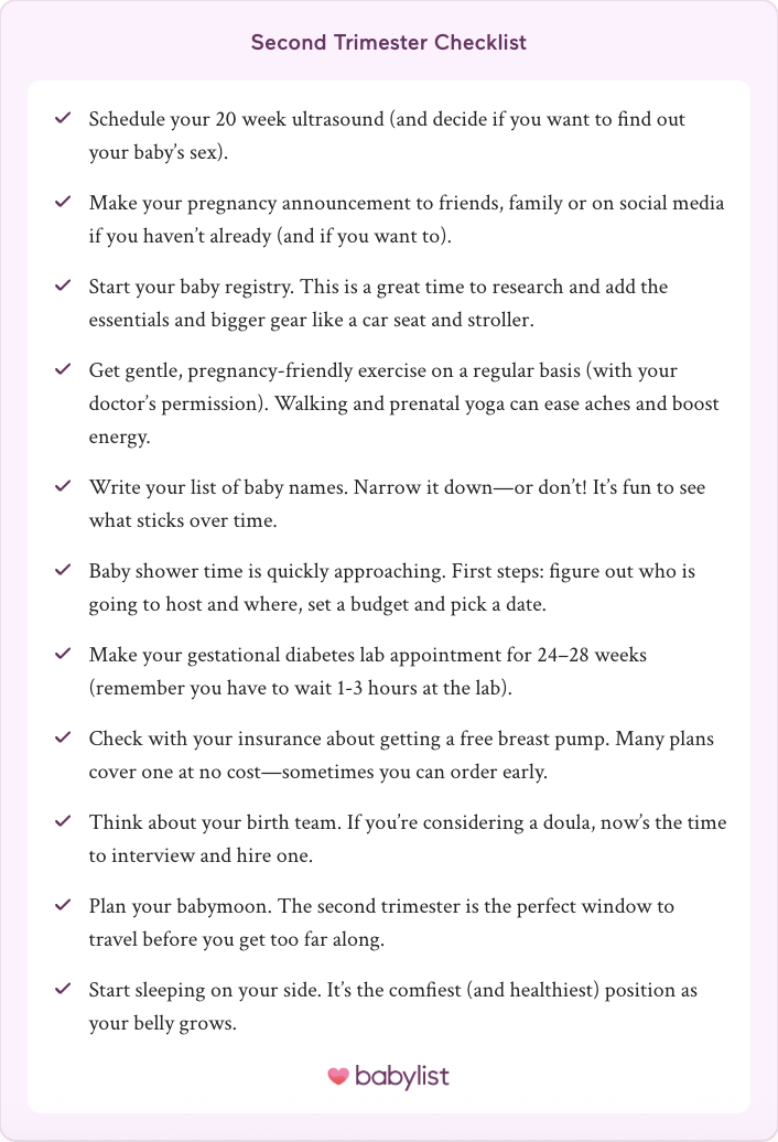 Enjoy this phase if you can—it’s often the most comfortable part of pregnancy, compared to the first and third trimesters. Take advantage of your renewed energy to build your baby registry, plan your nursery or take a babymoon. Just remember to continue to rest when you need to and listen to your body’s cues.